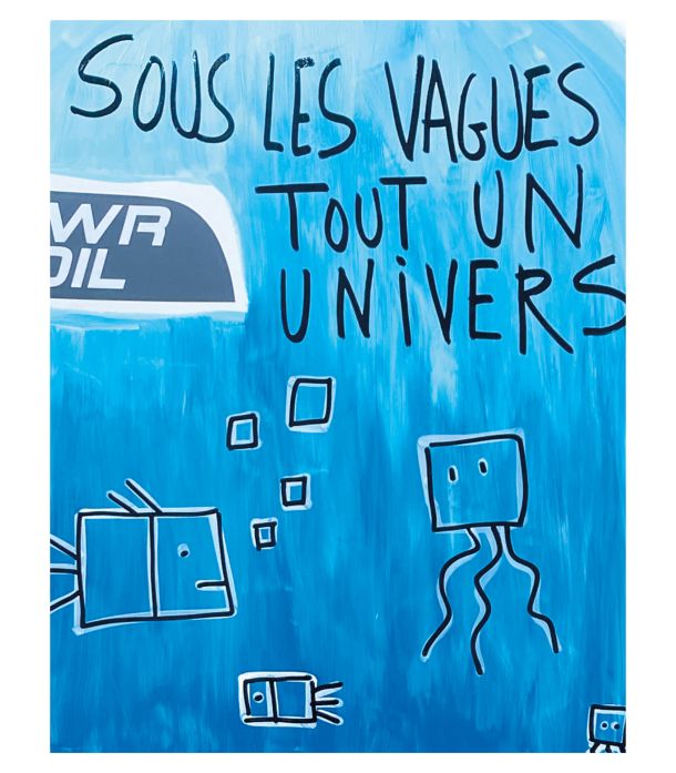 Une autre sur le thème de Collioure, avec devant, l’emblématique phare et son environnement marin et au dos, là où les poissons peuvent l’observer…